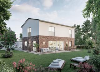 Haus in purem, zeitlosen Design mit zwei Vollgeschossen und geteilter Fassade.